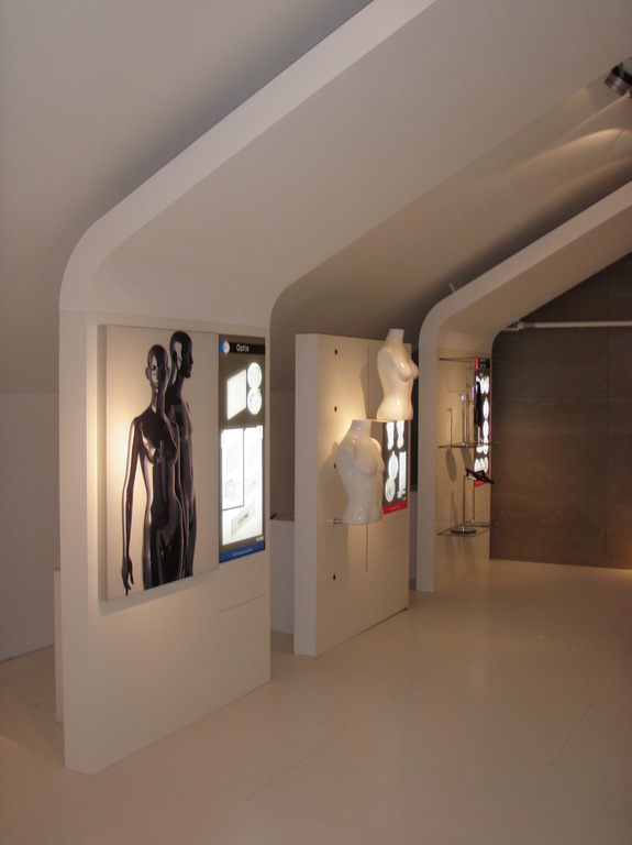 Besondere Herausforderung bei dieser Arbeit waren die Räumlichkeiten, in denen der Cubic-Showroom geplant werde mußte: durch seine Lage im ersten Stock mußten die vorhandenen Dachschrägen mit berücksichtigt werden.